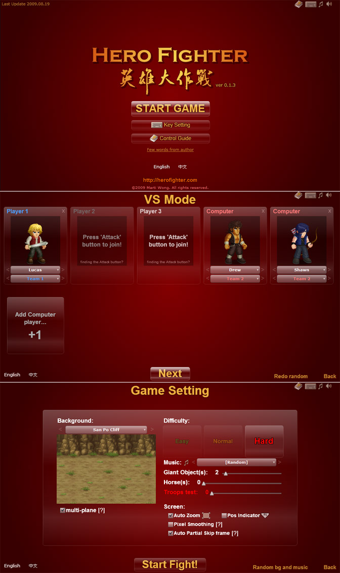 Hero Fighter supports up to 3 human players playing in the same computer. (network game supported later). First of all, you need to know what is your control keys.